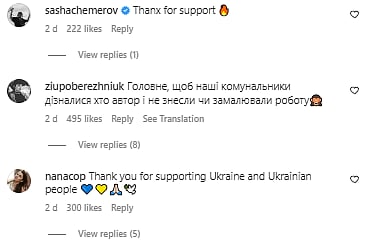 The art work was well received by fellow talents and followers. “Simply genious,” wrote a netizen, while many thanked the artist for supporting Ukraine and Ukrainian people by giving them a voice through his murals.
